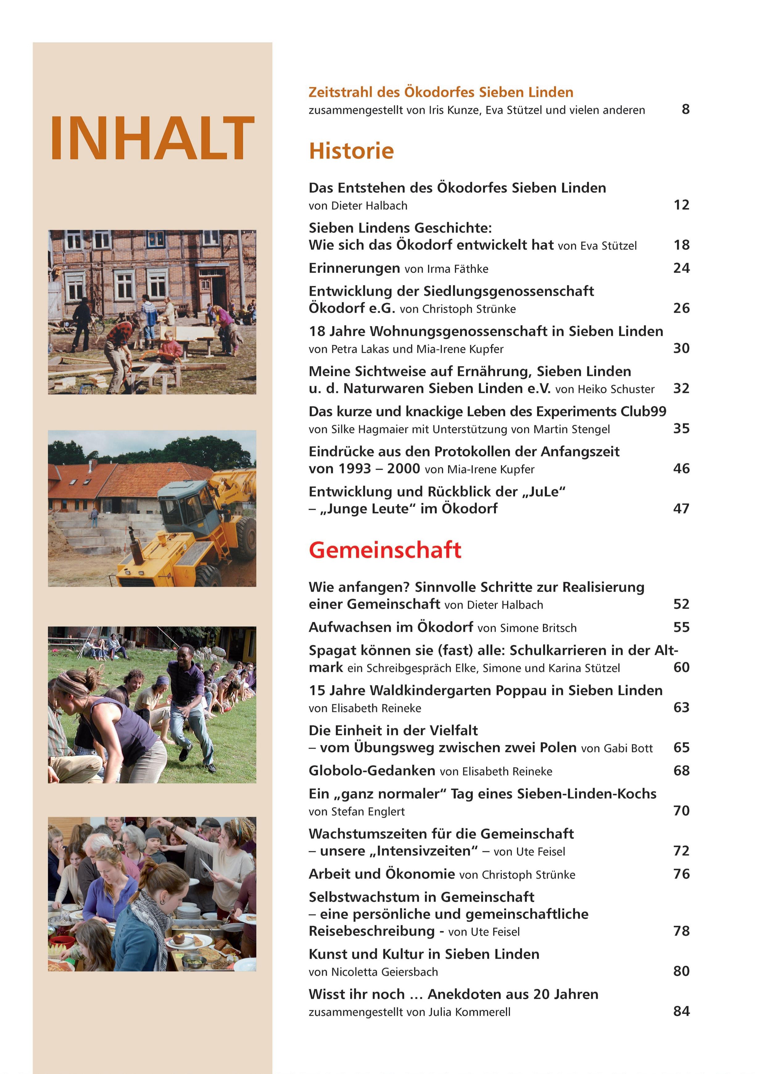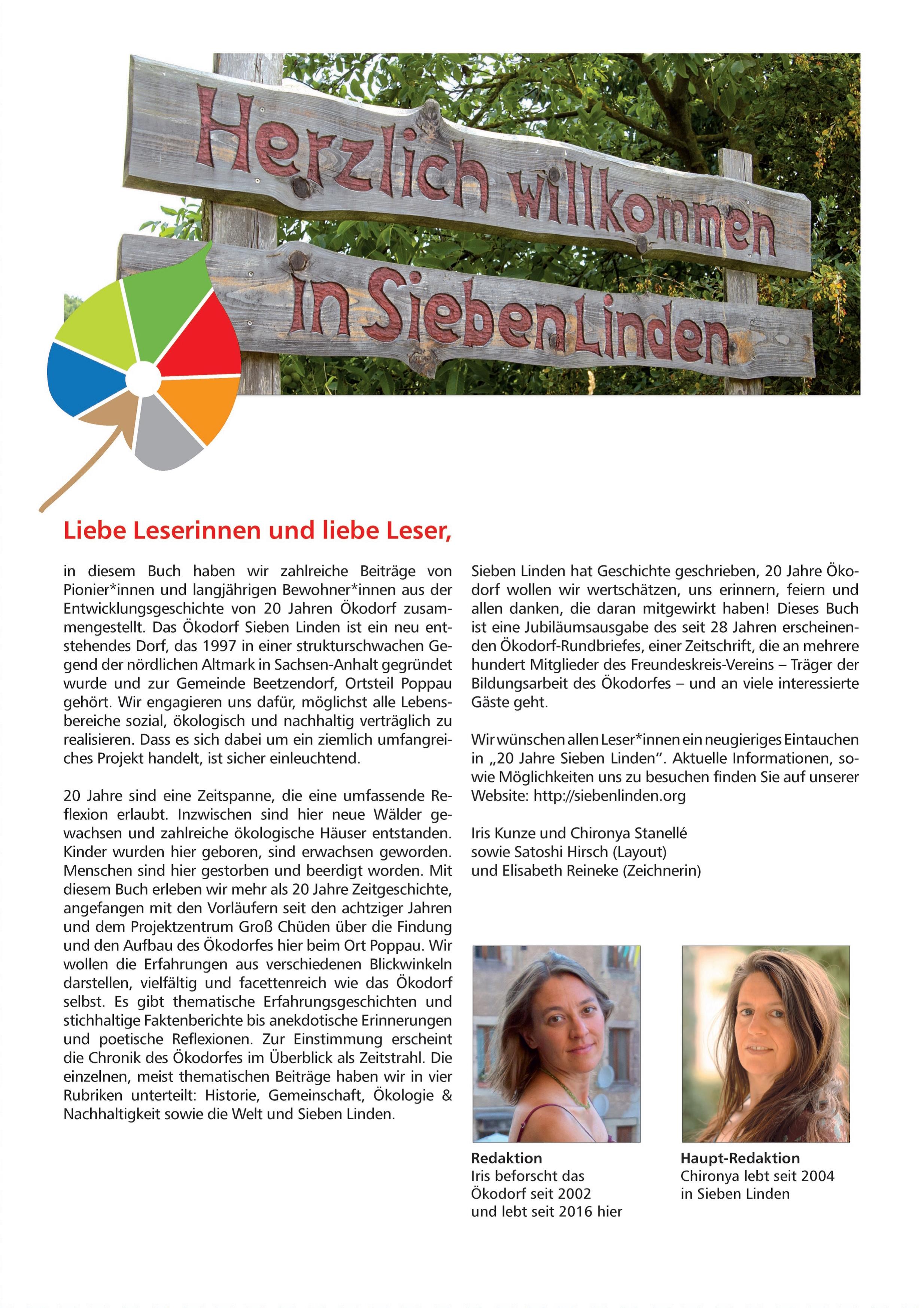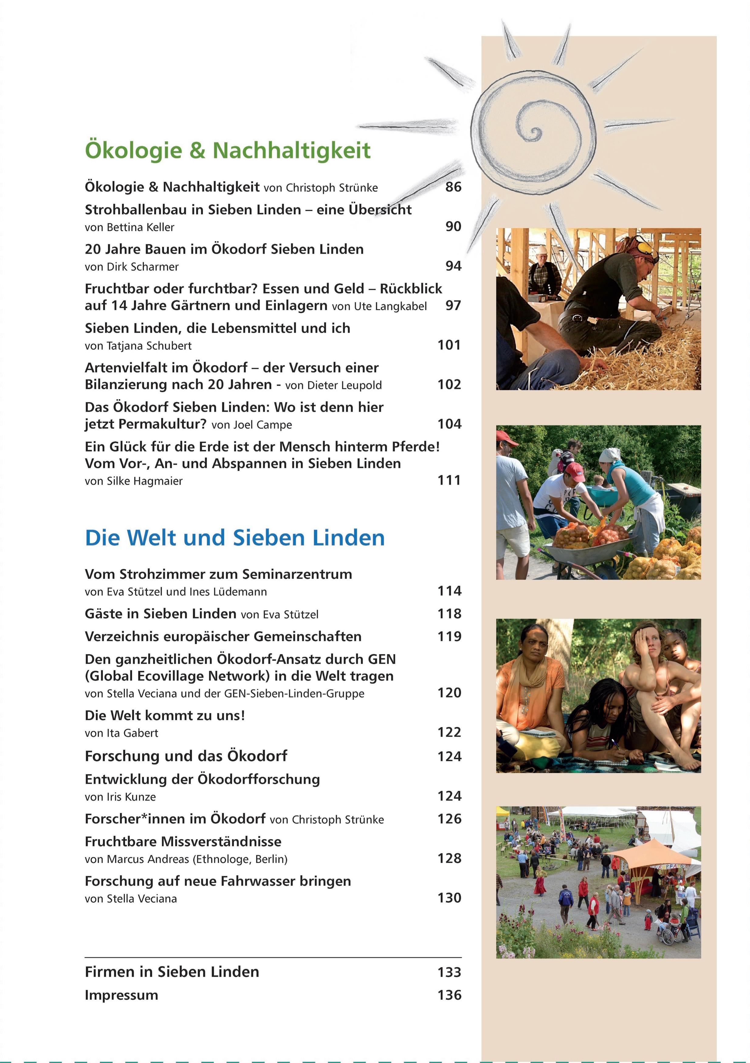 In diesem bunt bebilderten Buch im Zeitschriftenformat vermittelt das Ökodorf Sieben Linden seine Erfahrungen aus über 20 Jahren ökologischen Gemeinschaftsaufbaus und Zusammenlebens. Mehr als 25 langjährige Bewohner, Gründer und Aktive des Ökodorfes schildern und reflektieren vorwiegend aus persönlicher Sicht die Erfahrungen und Errungenschaften des Ökodorfes wie Gemeinschaftsentwicklung, Strohballenbau oder Selbstversorgung. Erstaunlich detailliert, tief bewegend und selbstkritisch wird das Ökodorf aus zahlreichen Perspektiven beschrieben. Das Buch besteht aus thematischen Erfahrungsgeschichten, stichhaltigen Faktenberichten, anekdotischen Erinnerungen bis hin zu poetischen Reflektionen. Die Artikel sind in vier Rubriken eingeteilt: Historie, Gemeinschaft, Ökologie & Nachhaltigkeit sowie die Welt und Sieben Linden. Die Chronik des Ökodorfes im Überblick wird mit einem Zeitstrahl eingeführt. Das Buch richtet sich an eine wachsende interessierte Öffentlichkeit, an Menschen, die selbst Gemeinschaft gründen wollen oder in ihrem sozialen Umfeld mehr ökologisches Leben umsetzen möchten und natürlich an die Freunde des Ökodorfes (Iris Kunze, Redaktion).