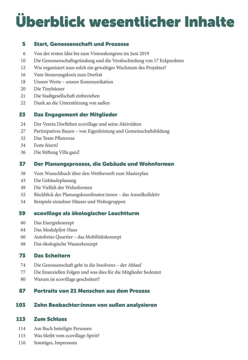 Das Buch dokumentiert das umfassende Engagement der „ehemaligen zukünftigen Bewohner:innen“ im Planungsprozess seit dem Projektbeginn im Jahr 2019, analysiert die Gründe des Scheiterns und berichtet von den Auswirkungen auf die betroffenen Menschen. Es soll helfen, auch Positives vom »ecovillage-Spirit« für zukünftige andere ökosoziale Wohnprojekte zu vermitteln.