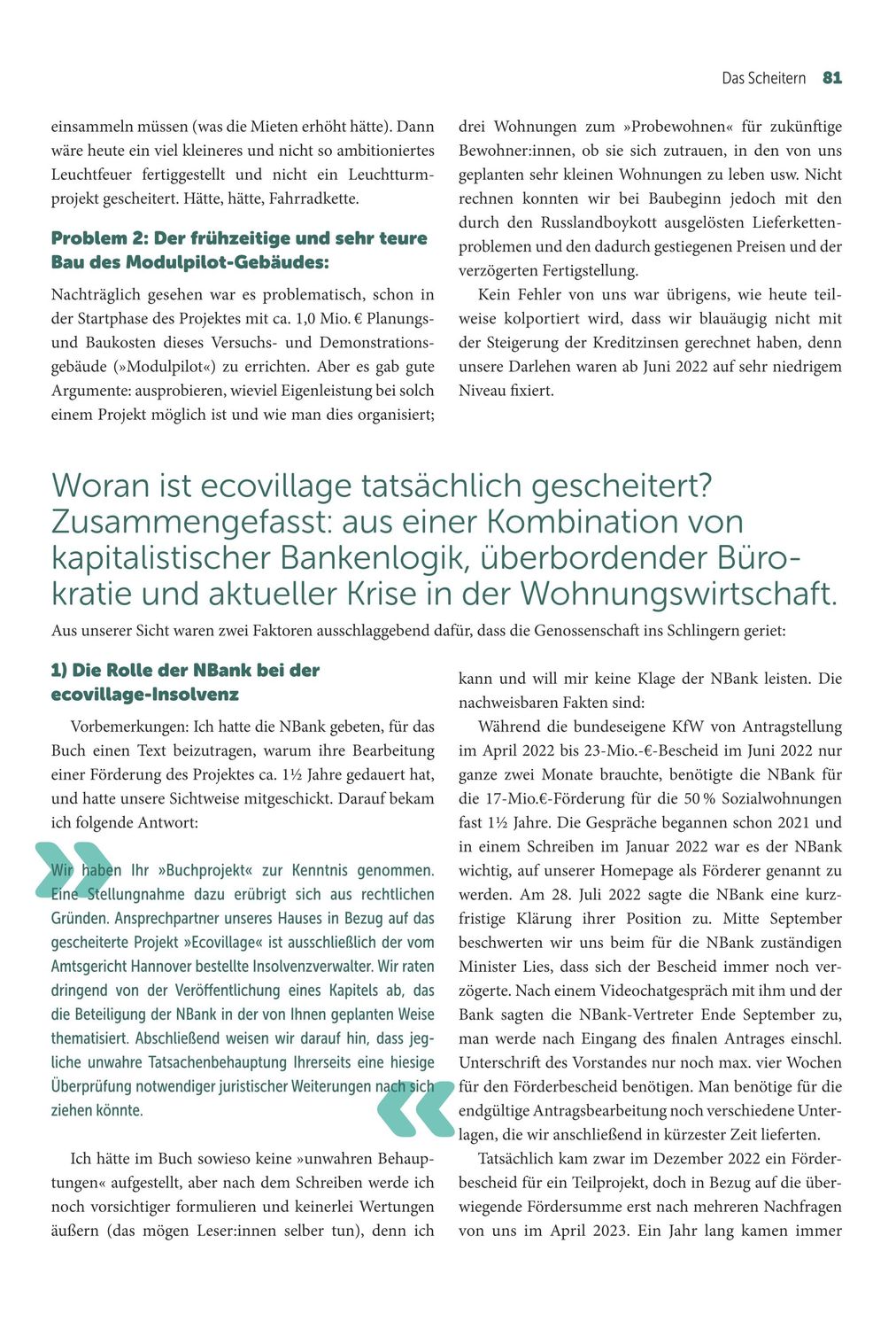Die Vision des ecovillage Hannover: viel gemeinschaftliches Leben in einem städtischen Neubauquartier mit sehr hohem ökosozialen Standard und einer suffizienten (bescheidenen) Lebensweise – ein Ökodorf im urbanen Umfeld. Das Ziel: nachhaltigen und bezahlbaren Wohnraum schaffen, geplant von den zukünftigen Bewohner:innen. Die Vision stand kurz davor, Wirklichkeit zu werden, doch im November 2023 kam der Absturz: Kurz vor Baubeginn der ersten 160 Wohnungen musste die Genossenschaft Insolvenz anmelden – das Projekt war tot!