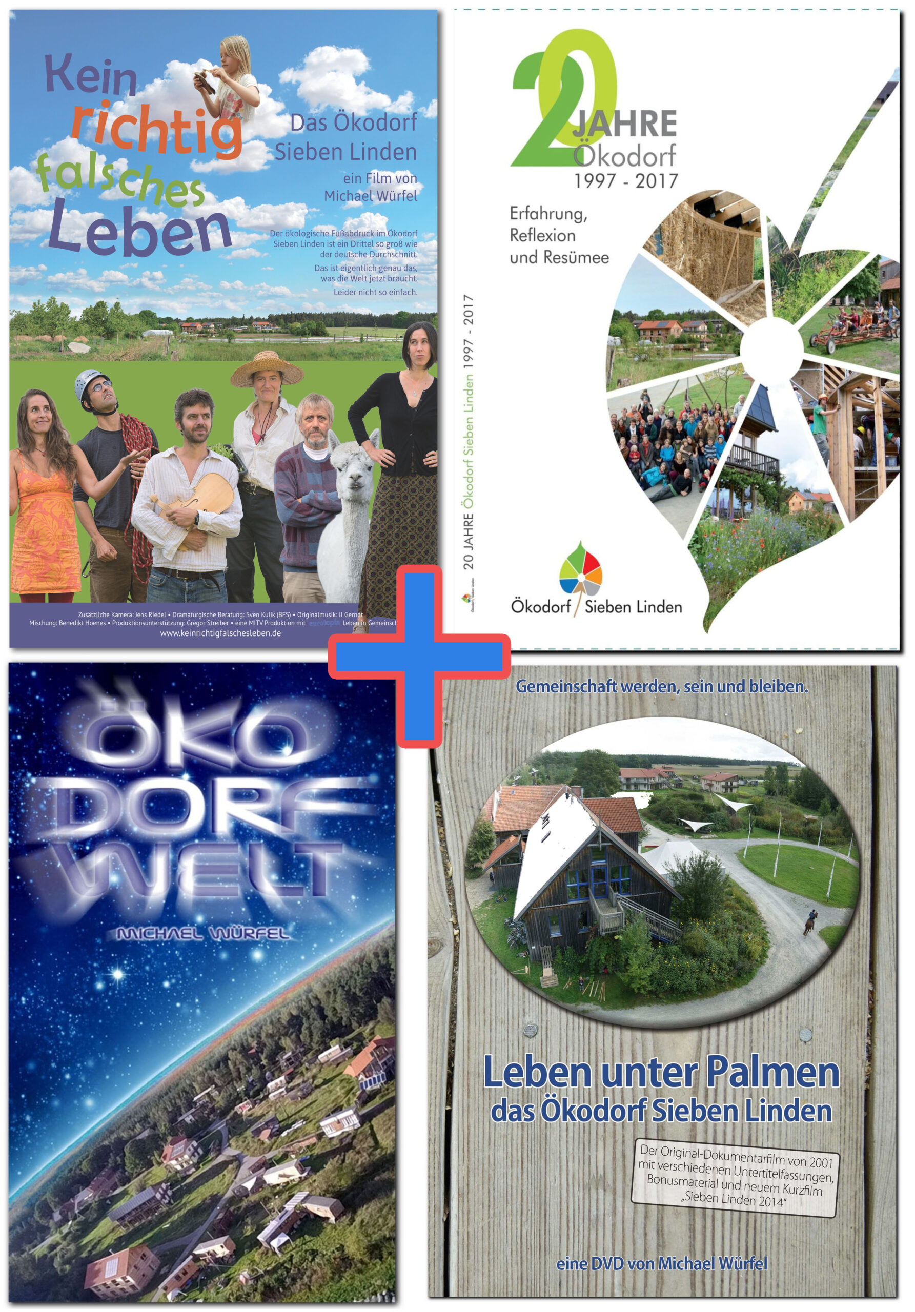 Ein Paket aus den Artikeln „Kein richtig falsches Leben“ (DVD, 2021), „Leben unter Palmen“ (DVD, 2002), „20 Jahre Sieben Linden“ (Buch) und „Öko Dorf Welt“ (Buch).